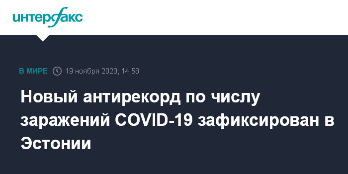 Москва. 19 ноября. INTERFAX.RU - В странах Балтии за сутки выявлено 2 460 новых случаев коронавируса, из которых 414 зарегистрировано в Эстонии (что стало новым антирекордом для этой страны), 1 680 - в Литве, 366 - в Латвии.