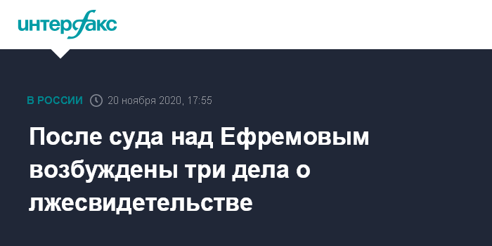 Москва. 20 ноября. INTERFAX.RU - В полиции возбудили три уголовных дела в отношении свидетелей, которые подозреваются в даче заведомо ложных показаний (ч. 1 ст. 307 УК РФ) по делу артиста Михаила Ефремова, сообщила журналистам официальный представитель МВД России Ирина Волк.