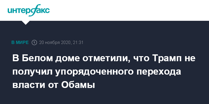 Москва. 20 ноября. INTERFAX.RU - Нынешний президент США Дональд Трамп после выборов в 2016 году не получил возможность организовать плавную передачу власти от администрации Барака Обамы, заявили в пятницу в Белом доме.