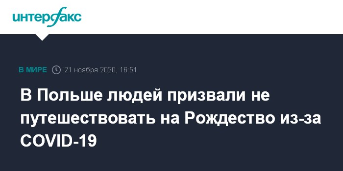 Москва. 21 ноября. INTERFAX.RU - Жителям Польши желательно воздержаться от путешествий на Рождество, это поможет сдержать распространение коронавируса COVID-19, заявил в субботу польский премьер Матеуш Моравецкий.