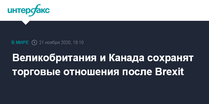 "Великобритания и Канада согласились сохранить их существующие торговые отношения, на которые приходится 20 млрд фунтов стерлингов. Стороны согласились начать переговоры, самое раннее - в следующем году, по более амбициозной торговой сделке", - говорится в сообщении министерства внешней торговли Великобритании.