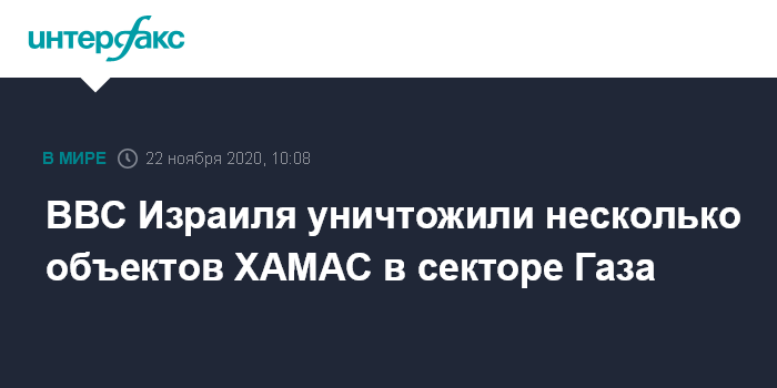 Москва. 22 ноября. INTERFAX.RU - ВВС Израиля в ночь на воскресенье нанесли удары по военным целям палестинской группировки ХАМАС, сообщает армия обороны Израиля на своей странице в твиттере.