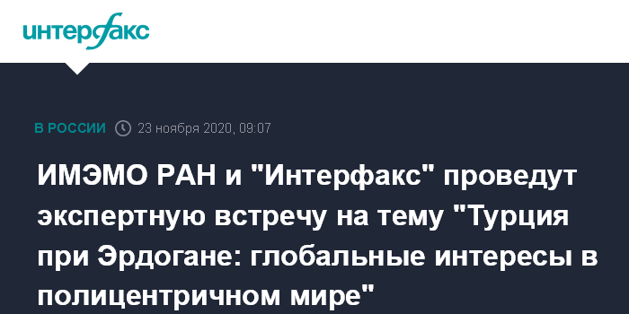 Москва. 23 ноября. INTERFAX.RU - В четверг, 26 ноября, в 11:30 состоится вторая экспертная встреча в рамках совместного проекта ИМЭМО-"Интерфакс" "Россия и мир: профессиональный разговор" на тему "Турция при Эрдогане: глобальные интересы в полицентричном мире".