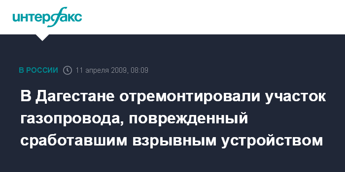 Ростов-на-Дону. 11 апреля. ИНТЕРФАКС-ЮГ - Ремонтные бригады завершили работы по восстановлению поврежденного участка магистрального газопровода Моздок - Казимагомед, сообщил агентству "Интерфакс-Юг" источник в правительстве Дагестана.