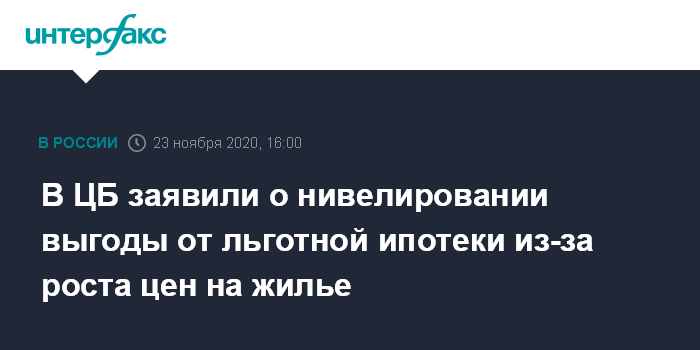 Москва. 23 ноября. INTERFAX.RU - Рост цен на новостройки в России практически нивелировал выгоду от программы льготной ипотеки под 6,5%, сообщила в понедельник зампред Банка России Ольга Полякова.