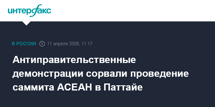 Москва. 11 апреля. INTERFAX.RU - Саммит между Китаем и Ассоциацией стран Юго-Восточной Азии (АСЕАН), планировавшийся в Паттайе, отложен из-за действий антиправительственных демонстрантов, сообщает британская телерадиовещательная корпорация Би-Би-Си.