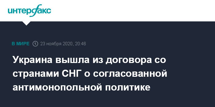 "Согласно документу, Украина выходит из Договора о проведении согласованной антимонопольной политики, подписанного на заседании Совета глав правительств государств-участников Содружества независимых государств в Москве 25 января 2000 года и ратифицированного Верховной Радой Украины с оговорками законом от 16 января 2003 года N449-IV", - говорится в сообщении.