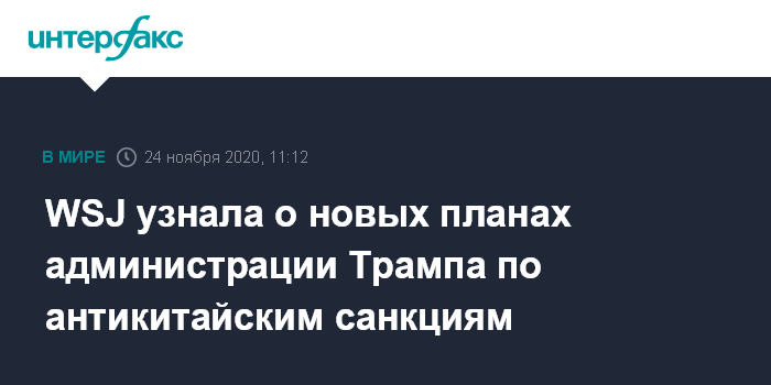 Москва. 24 ноября. INTERFAX.RU - Высокопоставленные сотрудники администрации президента США Дональда Трампа добиваются принятия новых жестких мер в отношении Китая, несмотря на то, что срок полномочий Трампа на посту главы государства заканчивается через два месяц, пишет The Wall Street Journal со ссылкой на чиновников администрации.