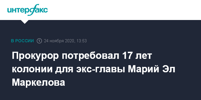 Москва. 24 ноября. INTERFAX.RU - Гособвинитель попросил суд назначить бывшему главе Марий Эл Леониду Маркелову наказание в виде 17 лет колонии строгого режима со штрафом 235 млн рублей за коррупционные преступления, сообщила "Интерфаксу" адвокат подсудимого Елена Вяткина.