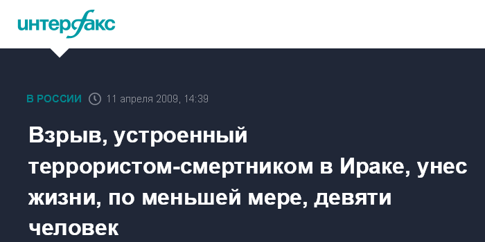 Москва. 11 апреля. INTERFAX.RU - Террорист-смертник атаковал в Ираке в субботу суннитский милицейский патруль, сообщает британская телерадиокорпорация Би-Би-Си.
