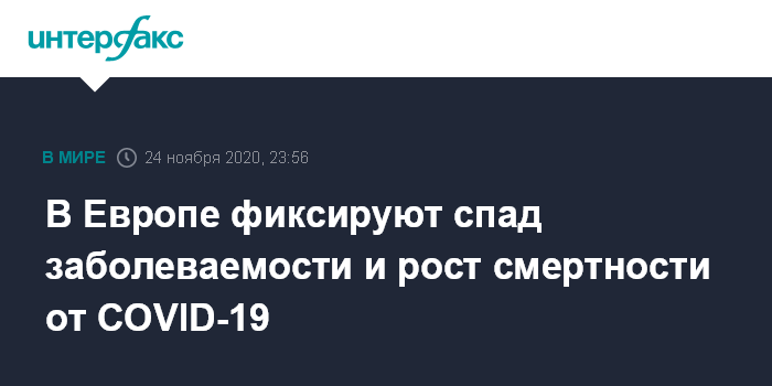 Москва. 24 ноября. INTERFAX.RU - В некоторых странах Европы регистрируют максимальные показатели суточной смертности среди инфицированных коронавирусом COVID-19, в то же время наблюдается снижение темпов распространения инфекции, в частности, во Франции и Великобритании.