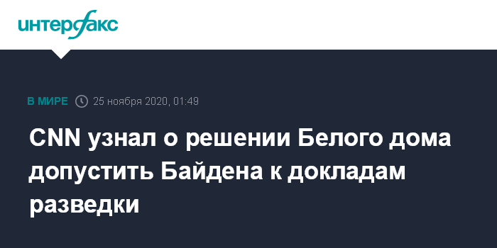Москва. 25 ноября. INTERFAX.RU - Белый дом дал разрешение на предоставление кандидату в президенты США Джо Байдену доступа к письменным ежедневным президентским докладам, которые готовят разведслужбы, сообщает CNN со ссылкой на сотрудника Белого дома.