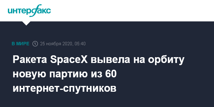 Москва. 25 ноября. INTERFAX.RU - Тяжелая ракета-носитель Falcon 9 в среду утром по московскому времени успешно вывела на низкую околоземную орбиту новую партию из 60 мини-спутников, предназначенных для продолжения развертывания глобальной сети интернет-покрытия системы Starlink, сообщила компания-разработчик SpaceX.