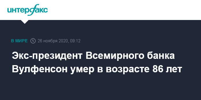 Москва. 26 ноября. INTERFAX.RU - Бывший президент Всемирного банка Джеймс Вулфенсон, возглавлявший организацию с 1995 по 2005 год, скончался в возрасте 86 лет.
