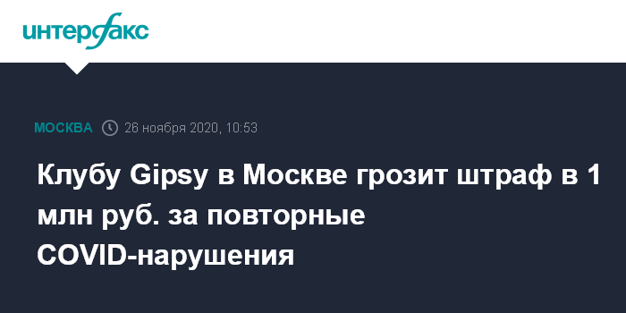 "Во время режима повышенной готовности запрещена работа всех развлекательных заведений, в том числе ночных клубов, дискотек и кальянных. Однако 20 ноября клуб GIPSY повторно нарушил требования карантинного режима, предписанного указом мэра Москвы. То есть посетители не соблюдали перчаточно-масочный режим, не соблюдали социальную дистанцию, и, кроме того, мероприятие закончилось после 23:00. В связи с этим администрации клуба вручено уведомление о вызове в ОАТИ Москвы", - сообщил в четверг журналистам главный инспектор ОАТИ Андрей Поплавский.