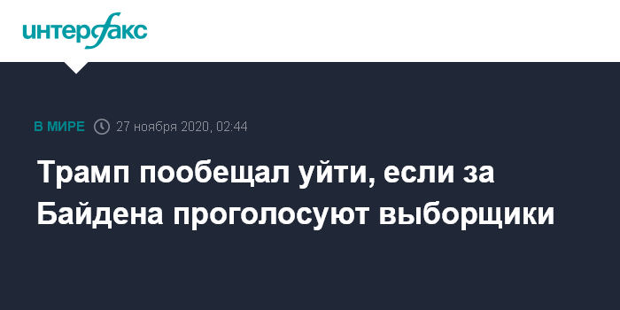 Москва. 27 ноября. INTERFAX.RU - Президент США Дональд Трамп заверил, что передаст власть кандидату в президенты от Демократической партии Джо Байдену, если за того проголосует коллегия выборщиков.