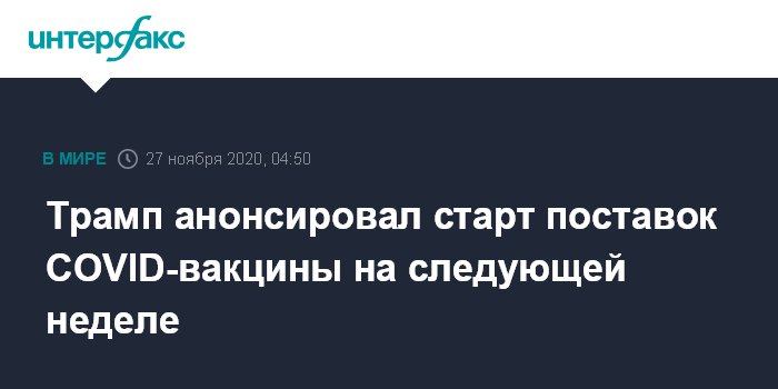 Москва. 27 ноября. INTERFAX.RU - Поставки вакцины от коронавируса в США начнутся на следующей неделе или неделей позже, заявил президент США Дональд Трамп.