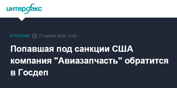 Попавшая под санкции США компания "Авиазапчасть" обратится в Госдеп