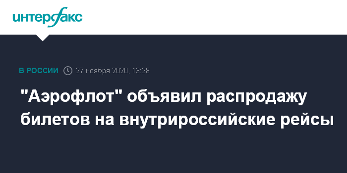 Москва. 27 ноября. INTERFAX.RU - Авиакомпания "Аэрофлот" с 27 по 29 ноября 2020 года проводит распродажу билетов на внутрироссийские рейсы "Аэрофлота" и авиакомпании "Россия", сообщает перевозчик в пятницу.