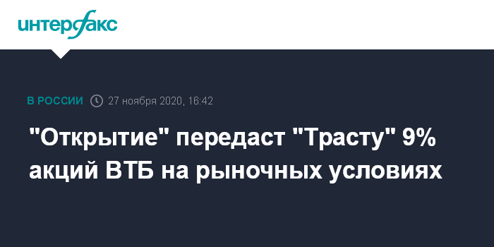 Москва. 27 ноября. INTERFAX.RU - Банк "ФК Открытие" передаст "Трасту" 9% акций ВТБ, которыми он владеет напрямую, акции будут переданы на рыночных условиях, сообщили "Интерфаксу" в пресс-службе регулятора.