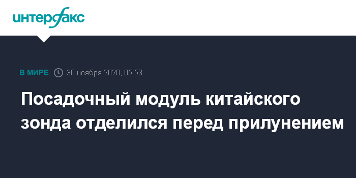 Москва. 30 ноября. INTERFAX.RU - Посадочный модуль китайской автоматической станции "Чанъэ-5" отделился от зонда, готовясь к прилунению, сообщило в понедельник Национальное космическое управление Китая (CNSA).