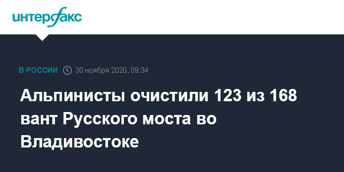 Москва. 30 ноября. INTERFAX.RU - Альпинисты очистили ото льда 123 из 168 вант моста на остров Русский, затем они будут чистить пилоны, сообщили в ФКУ "Межрегиональная дирекция по дорожному строительству" Росавтодора на Дальнем Востоке.