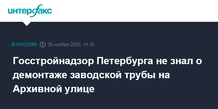 Госстройнадзор Петербурга не знал о демонтаже заводской трубы на Архивной улице