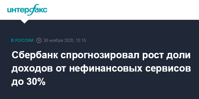 Москва. 30 ноября. INTERFAX.RU - Доля доходов Сбербанка от нефинансовых сервисов в чистом операционном доходе группы на горизонте 2030 года может составить 20-30%, сказал глава банка Герман Греф на Дне инвестора.