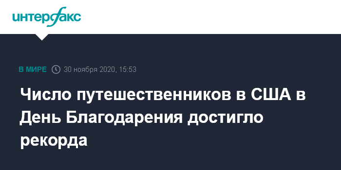 Москва. 30 ноября. INTERFAX.RU - Выходные после Дня Благодарения в США оправдали ожидания, оказавшись самым оживленным периодом путешествий с начала пандемии коронавируса, чему способствовали хорошая погода и более низкие цены на бензин, которые побудили некоторых американцев перемещаться на автомобиле, а не на самолете, пишет The Wall Street Journal.