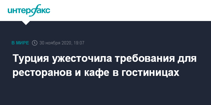 Москва. 30 ноября. INTERFAX.RU - МВД Турции в связи с ростом заболеваемости COVID-19 разослало в 81 провинцию страны циркуляр об ужесточении требований к ресторанам и кафе, находящимся на территории гостиниц.
