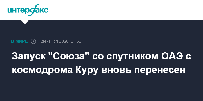 Москва. 1 декабря. INTERFAX.RU - В связи с техническими проблемами еще на сутки перенесен планировавшийся во вторник запуск российской ракеты-носителя "Союз-СТ" с космодрома Куру во Французской Гвиане с разведывательным спутником Объединенных Арабских Эмиратов Falcon Eye 2, сообщила французская компания-оператор запуска Arianespace.
