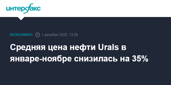 Москва. 1 декабря. INTERFAX.RU - Средняя цена нефти марки Urals в январе-ноябре 2020 года составила $41,04 за баррель, говорится в сообщении Минфина РФ.