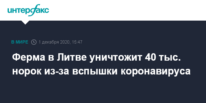Москва. 1 декабря. INTERFAX.RU - Норковая ферма Danmink в Йонавском районе Литвы усыпит около 40 тыс. норок, чтобы остановить дальнейшее распространение коронавируса, сообщает BNS.