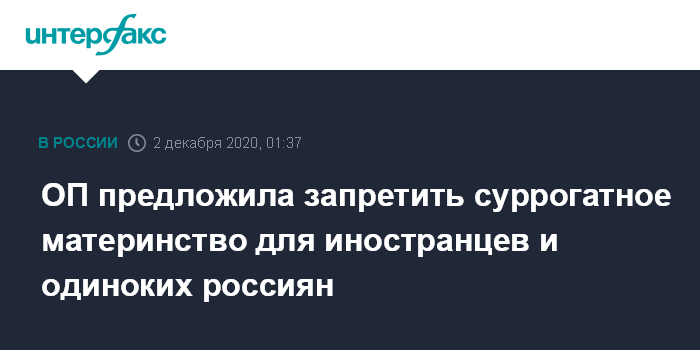 "Общественная палата подготовила проект резолюции по вопросу урегулирования суррогатного материнства в России. Среди предложений ОП - запрет на участие в программах сурматеринства иностранных граждан, запрет на его рекламу. Отказ от реализации суррогатного материнства на коммерческой основе, закрепление права использования программы только семейными парами и, соответственно, запрет для участия в программе одиноких мужчин и женщин", - говорится в публикации.
