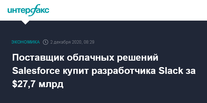Москва. 2 декабря. INTERFAX.RU - Американская Salesforce.com, поставщик облачных корпоративных решений для взаимодействия с клиентами, сообщила, что купит разработчика сервиса обмена сообщениями Slack Technologies.