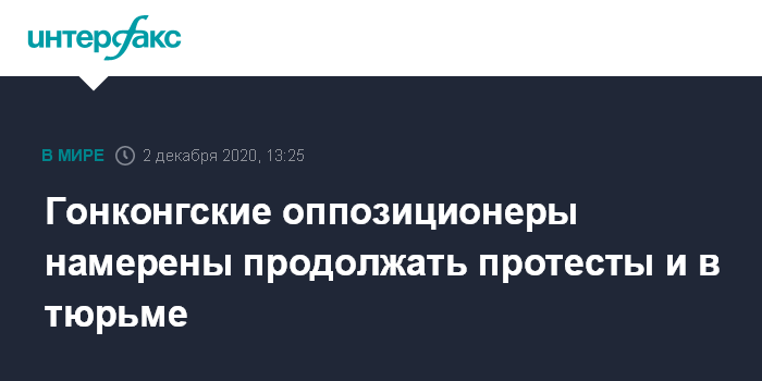 Москва. 2 декабря. INTERFAX.RU - Гонконгские оппозиционеры продолжат протесты и во время отбывания наказания в тюрьме, сообщил один из активистов движения за независимость Гонконга Джошуа Вонг.