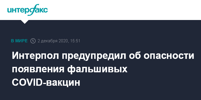 Москва. 2 декабря. INTERFAX.RU - Интерпол обеспокоен возможной угрозой со стороны организованной преступности в мире, которая может планировать распространять поддельные вакцины от коронавируса COVID-19 или красть настоящие, сообщает в среду издание The Guardian.