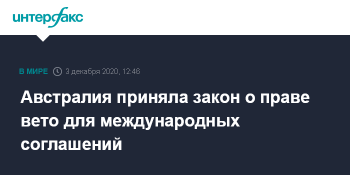 Москва. 3 декабря. INTERFAX.RU - Парламент Австралии принял закон, который наделит центральное правительство правом налагать вето на любое соглашение между представителями Австралии и иностранным правительством.