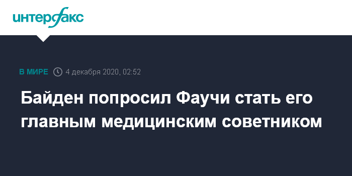 Москва. 4 декабря. INTERFAX.RU - Кандидат от Демократической партии Джо Байден, по предварительным данным, победивший на выборах президента США, попросил главного инфекциониста страны Энтони Фаучи остаться на посту директора Института аллергий и инфекционных болезней, а также стать главным медицинским советником и членом его команды реагирования на COVID-19.