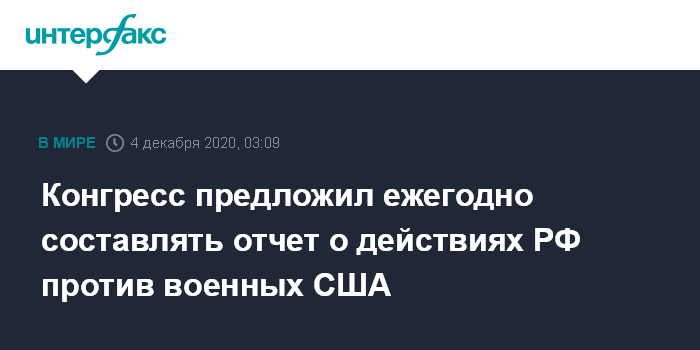 Москва. 4 декабря. INTERFAX.RU - Предложение о составлении ежегодного отчета о любых действиях России, направленных против американских военнослужащих, включено в американский законопроект о бюджетных ассигнованиях на национальную оборону на 2021 финансовый год (NDAA).
