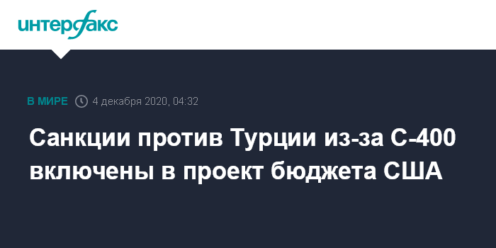 Москва. 4 декабря. INTERFAX.RU - Проект оборонного бюджета США на 2021 финансовый год, распространенный американским Конгрессом, предусматривает введение новых санкций против Турции за приобретение ею российских ЗРК С-400.