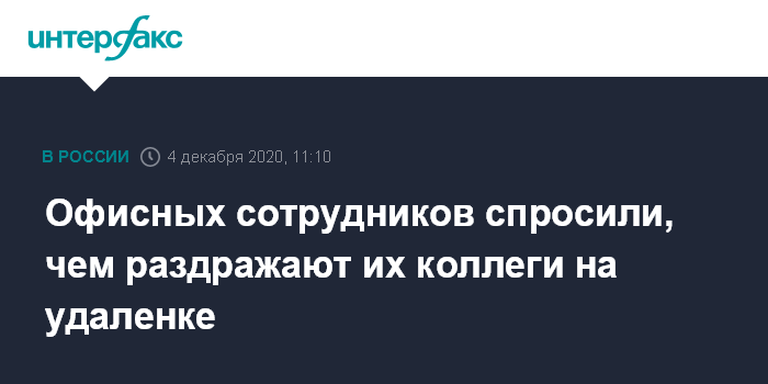 Москва. 4 декабря. INTERFAX.RU - Опрос работающих россиян показал, что привычки коллег при дистанционной работе раздражают гораздо меньше, чем в офисе: на удаленке 38% опрошенных сказали, что сослуживцы их ничем не раздражают, в офисе таких респондентов оказалось 18%.