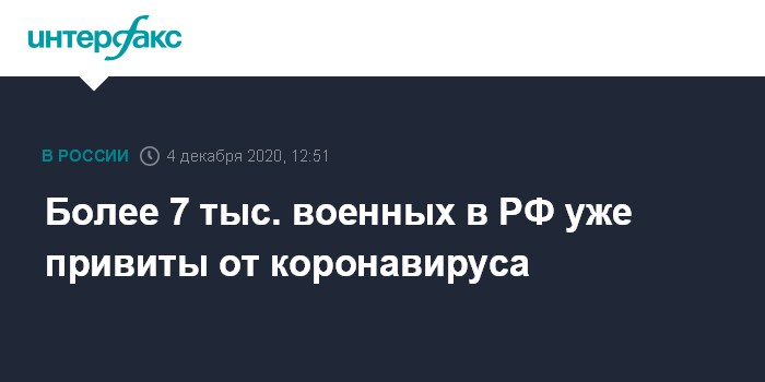 "По состоянию на начало декабря, получено 14,5 тысячи доз вакцины. Указанный объем распределен в военные округа, Северный флот и центральный аппарат Министерства обороны Российской Федерации. Уже вакцинированы 7 175 военнослужащих", - сказал Иванов.