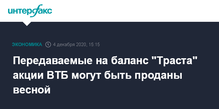 Москва. 4 декабря. INTERFAX.RU - Акции ВТБ, передаваемые "Открытием" на баланс "Траста", могут быть проданы инвесторам весной 2021 года, заявил журналистам глава ВТБ Андрей Костин в кулуарах Первого евразийского конгресса.