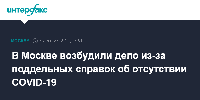 Москва. 4 декабря. INTERFAX.RU - Московские прокуроры признали незаконным постановление об отказе в возбуждении уголовного дела по факту выдачи поддельной справки об отсутствии коронавируса. Она была выдана от лица частной лаборатории.