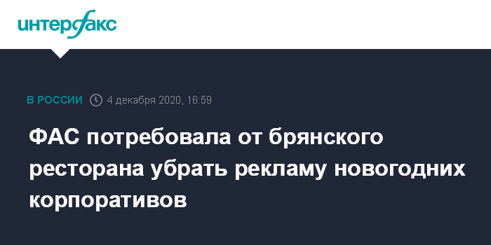 Москва. 4 декабря. INTERFAX.RU - Брянское УФАС признало ресторан "Журавли", вывесивший рекламу о проведении новогодних корпоративов в период распространения коронавирусной инфекции, нарушителем закона, сообщает антимонопольное ведомство.