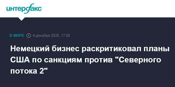 Москва. 4 декабря. INTERFAX.RU - Глава Восточного комитета немецкой экономики Оливер Хермес подверг критике планы США расширить санкции в отношении "Северного потока 2".