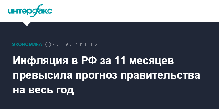 Таким образом инфляция за 11 месяцев уже превысила прогноз правительства на весь 2020 год, который равняется 3,8%, и уже подбирается к верхней границе интервала ЦБ (3,9-4,2%), которую с большой вероятностью достигнет на следующей неделе.