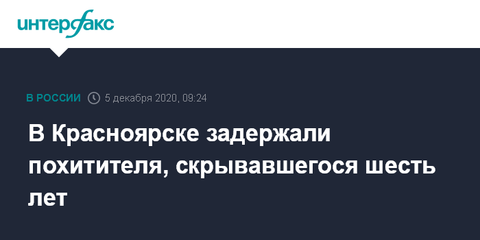 Москва. 5 декабря. INTERFAX.RU - Сотрудники правоохранительных органов задержали подозреваемого в похищении человека в Красноярском крае, он скрывался на протяжении шести лет, сообщила официальный представитель МВД России Ирина Волк журналистам.