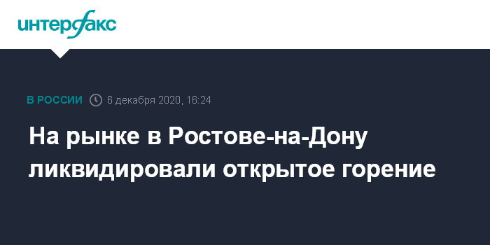Москва. 6 декабря. INTERFAX.RU - Ликвидировано открытое горение на рынке в Ростове-на-Дону, сообщили журналистам в МЧС по Ростовской области в воскресенье. По его данным, это произошло в 16:06.